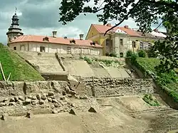 Однако археологические исследования на месте современного замка свидетельствуют, что замок и поселение появились тут не раньше XVI в. Так находки на территории замка относятся к концу XVI — началу XIX в. Многие из них похожи на материалы раскопок Мирского замка, который с 1568 г. принадлежал Радзивиллам[10]. Возможным местонахождением первоначального «двора Несвижа» считается городище, размещённое на правом берегу реки Уша, у самых её истоков, между современными деревнями Славкова и Качановичи Несвижского района приблизительно в 3—4 км на восток от современного города. Городище, известное среди местного населения под двумя названиями — Замковище и Богумилье, имеет размеры 64×36 м и размещено на высоком холме на краю осушенного болота. Археологические исследования, проведённые на нём в 1953 г. А. Г. Митрофановым, показали, что на памятнике есть материалы как железного века (I—V вв. н. э.), так и XI — начала XVI вв., однако большинство средневековых материалов относится к XII—XV вв. Рядом с городищем размещено и селище площадью более 4 га с материалами XI—XVI вв., хотя большая их часть, как и на городище, также относится к XII—XV вв. Кроме того, в начале XX в. рядом с городищем отмечалось и наличие курганного могильника[11]. Все эти факты позволяют предполагать, что поселение на городище Замковище и есть то самый «двор Несвиж», про который повествуется в письменных источниках, что само городище значительно старше письменных упоминаний про Несвиж, и поселение возникло не позже XII в. Исследователи считают, что где-то в 1-й половине XVI в. замок был перенесён с Замковища на теперешнее место. Причиной переноса центра волости на новое место могла быть малая площадь старого городища, что не содействовало его развитию. Об это свидетельствуют и археологические материалы с городища, согласно которым жизнь на этом месте прекратилась на границе XV—XVI вв[12].