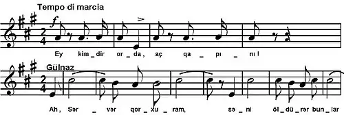 В комедии возник самостоятельный мир лирических образов — напевная кантилена, приближающаяся к песенно-ариозной. Сарвер И Гюльназ здесь характеризуются в дуэтных отрывках, а мягкая и мелодичная музыка (в тексте использованы газели Физули) выражает иной круг чувств и настроений[12].