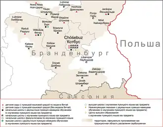 В соответствии с «Законом о правах лужицких сербов / вендов в Бранденбурге» от 7 июля 1994 года, в область расселения бранденбургских серболужичан, в которой до нашего времени сохраняется преемственность культурной и языковой традиции серболужичан и обеспечиваются права нижнелужицкого языка[26], входят: