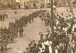С середины марта 1919 года в окрестностях Новогрудка начали появляться отряды Войска Польского. 18 апреля 1919 года на рассвете, после нескольких часов боя, солдаты 2-го Ковенского стрелкового полка майора Леона Лады-Завистовского и два эскадрона 10-го уланского полка захватили город. В боях на стороне Красной Армии принимало участие много поляков-коммунистов из Западной Дивизии Стрелков. В результате захвата города Войско Польское получило большие склады военной амуниции и боеприпасов, а также захватили около 300 пленных[55]. Польско-большевистский фронт остановился на несколько месяцев вдоль линии бывших немецких окопов на реках Сервеч и Уши.
