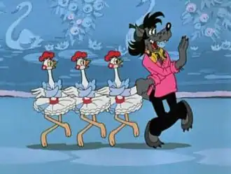 Затем начинается балет, где Волк танцует с Курицами, а затем — с Зайцем.