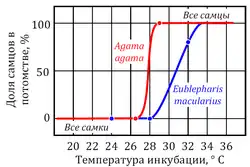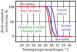 К видам с температурозвисимым определением пола относятся все крокодилы, большинство черепах, некоторые виды ящериц[50], а также гаттерии[51]. Обычно при низких температурах (ниже 27 ºС) из яиц вылупливаются особи одного пола, при высоких (выше 30 ºС) — другого, и только в небольшом промежуточном интервале — особи обоих полов. Так, у черепах при низких температурах появляются только самцы, у ящериц — только самки. Существуют отклонения от этой схемы. У каймановой черепахи при температурах от 20 до 30 ºС преобладают самцы, за пределами этого интервала — самки[50]. Эти температурные пороги обозначаются как порог I и порог II соответственно. Температуры, необходимые для развития каждого пола, называются женскими и мужскими благоприятствующими температурами (англ. the female and the male promoting temperature)[52] .