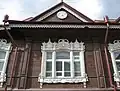 Окна второго этажа обрамляют наличники, декорированные объёмной и накладной резьбой из резных боковых колонок и сложно профилированных завершений. Надоконные доски украшены фестонами с кистями, подоконные доски декорированы стилизованным растительным орнаментом.