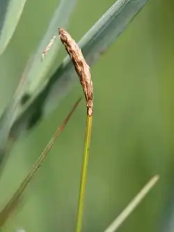 Колосок тычиночный или пестичный (растения двудомные), очень редко андрогинный (с 1—2 пестичными цветками у основания). Тычиночные колоски продолговато-булавовидные; чешуи округло-тупые, ржавые, почти без перепончатого края. Пестичные колоски плотные, продолговато-яйцевидные или яйцевидные, 0,6—1,5 см длиной. Кроющие чешуи яйцевидные или широкояйцевидные, тупые или притуплённые, большей частью тёмно-бурые, с широкими, иногда с очень узкими белоперепончатыми краями, короче мешочков. Мешочки яйцевидные, плоско- или неравно-двояковыпуклые, толстокожистые, (2,5[1])3—3,5[1](4,5) мм длиной, зрелые горизонтально или вниз отклонённые, с утолщёнными жилками, на короткой утолщённой ножке, постепенно, с небольшим изгибом сужены в шероховатый цельный, косо усечённый, перепончато-окаймлённый носик 0,8—1(1,3) мм длиной. Рылец 2.
