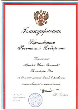 - Благодарность Президента Российской Федерации (9 апреля 1996 г.) — за большой личный вклад в развитие отечественной космонавтики[12].