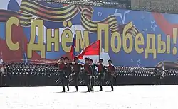 Торжественное прохождение войск открыла рота барабанщиков института военных дирижёров Военного университета МО РФ, после которой по Красной площади прошли знаменные группы с государственным флагом РФ, Знаменем Победы, которое специально для этого доставили из Центрального музея Вооружённых сил, знаменем Вооружённых сил РФ, а также военнослужащие, которые понесли штандарты фронтов, знаменная рота и почётный караул трёх видов Вооружённых сил РФ.