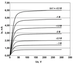Анодные вольт-амперные характеристики (ВАХ) маломощных пентодов близки к идеальным: резкий переход из режима возврата в режим перехвата происходит при относительно низких плоские «полки» ВАХ свидетельствуют о высоком выходном сопротивлении (6Ж32П — 2,5 МОм в номинальном режиме [75]). Это позволяет строить на пентодах почти совершенные дифференциальные каскады[76] и активные нагрузки (стабильные источники тока)[77]. В мощных пентодах выходное сопротивление относительно низкое, а переход в зону перехвата растянут. При малых анодных напряжениях и большом отрицательном смещении управляющей сетки наблюдается «тетродная» нелинейность полки ВАХ.