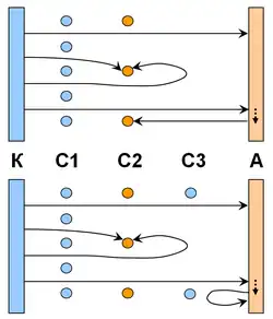 В нормальном рабочем режиме третья сетка пентода соединена с катодом, на первую (управляющую) сетку подаётся постоянное отрицательное напряжение смещения UC1, на вторую (экранирующую) сетку — постоянное положительное напряжение Uc2, равное или меньшее напряжению питания каскада. У электронов, эмитированных катодом (ток катода IK), в этом режиме есть только два пути — с катода на экранирующую сетку (ток экрана Ic2), и с катода на анод (ток анода Ia). Ток катода практически не зависит от анодного напряжения Ua: он определяется только напряжениями на управляющей и экранирующей сетках[53]. Предельно упрощённая формула тока катода сводится к ВАХ эквивалентного диода по закону Чайлда — Ленгмюра[note 11][54]: