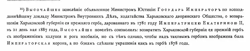 21 мая 1887 года по ходатайству Харьковского дворянского общества Александром Третьим городу и губернии[19] был возвращён «екатерининский» герб, сохранивший, однако, обрамление нового герба — императорскую (а не обычную городскую) корону и дубовые листья с Андреевской лентой.[26] Данный герб просуществовал до провозглашения Советской власти и использовался в архитектуре (в витражах, лепке, мозаике на фасадах зданий), — например, Алексеем Бекетовым.