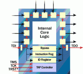 Затем некая тестовая последовательность (тестовый вектор — Test Vector), двоичная — состоящая из нулей и единиц, вводится в тестовый порт (TAP). Она проходит последовательно через все ячейки периферийного сканирования (BS Cells). На выходе (TDO) она анализируется специальным программным обеспечением, после чего делаются соответствующие выводы о состоянии инфраструктуры данной микросхемы.