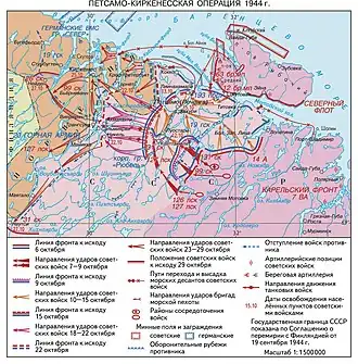 1. Область Петсамо (Печенга) была передана Финляндией Советскому Союзу 19 сентября 1944 года по результатам Московского перемирия и де-факто находилась под немецкой оккупацией до конца октября 1944 года.