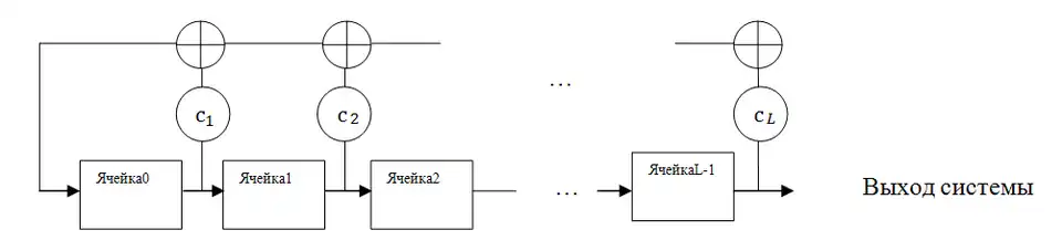 Определение: Регистр сдвига с линейной обратной связью длины L состоит из L ячеек пронумерованных ,каждая из которых способна хранить 1 бит и имеет один вход и один выход; и синхросигнала (clock), который контролирует смещение данных. В течение каждой единицы времени выполняются следующие операции: