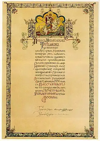 - Грамота почётного гражданина города Москвы, представляющая собой прямоугольный лист размером 460×310 мм, украшенный орнаментом, выполненным в традициях русского стиля со включёнными в него окнами с изображением зданий, связанных с прошлым и настоящем города Москвы. Грамота представляет собой офорт, печатаемый и раскрашиваемый вручную. (См. более подробное описание грамоты Архивная копия от 9 января 2012 на Wayback Machine.)