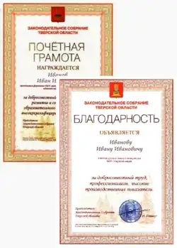 Почётная грамота является наградой Губернатора Тверской области. Почётной грамотой награждаются граждане Российской Федерации, иностранные граждане, лица без гражданства, а также организации за значительные достижения, направленные на пользу области, обеспечение её благополучия. К награждению Почётной грамотой представляются, как правило, лица (организации), которым ранее была объявлена благодарность Губернатора Тверской области. ––– Благодарность Губернатора Тверской области объявляется гражданам Российской Федерации, иностранным гражданам, лицам без гражданства, а также организациям за значительные достижения, направленные на пользу области, обеспечение её благополучия. Ходатайство об объявлении благодарности возбуждается, как правило, при наличии у представляемых лиц (организаций) поощрений органов местного самоуправления или поощрений областных исполнительных органов государственной власти Тверской области. |