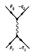 Пользуясь приведёнными правилами Фейнмана, получим матричный элемент процесса е−+е− → е−+е− (то есть мёллеровского рассеяния электронов) в низшем, втором по e, порядке теории возмущений. Единственной диаграммой оказывается диаграмма, приведённая на рис. 6. Используя введённые на этом рисунке импульсные обозначения, положим, что импульсы электронов в начальном состоянии равны p1 и р2, а электроны конечного состояния обладают импульсами — q1 , q2 (при этом, разумеется, q10 < 0, q20 < 0). Используя правила (1), (2), (5), (6) и (8), находим: