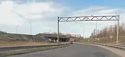Для вывода транспорта на высокий правый берег исключая серпантин на правобережном склоне устроена выемка глубиной 40 метров и сам мост имеет уклон около 35 промилле.