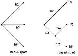 На левом графе есть три исхода с вероятностями , , , образующих полную группу событий (то есть ). На правом графе мы сначала выбираем между двумя возможностями, каждую с вероятностью . Если выбрана вторая возможность, тогда делается ещё один выбор с вероятностями и . Энтропии на обоих графах должны получиться одинаковыми, поскольку в конечном счете получаются те же самые исходы с теми же вероятностями. По закону композиции запишем .