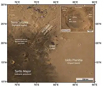 - 18 февраля 2021 года на северо-западном краю равнины, в кратере Езеро (18°26′41″ с. ш. 77°27′03″ в. д. / 18,4447° с. ш. 77,4508° в. д.), был посажен марсоход «Персеверанс» с вертолётом Ingenuity.