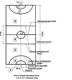 Отличия от футбола: иная разметка поля, вследствие наличия игровых зон (зона вратаря (1), зона штрафного удара (2), зона защиты (3), нейтральная зона (4), зона атаки(5)), фиксированный задний и передний офсайд, мяч вводится из аута ногами, наличие двух типов угловых, удаление игрока с поля на короткий промежуток времени за нарушение правил, запрещён пас своему вратарю любыми частями тела, возвращение вратаря после выхода из зоны вратаря разрешается только после гола (в свои или чужие ворота).