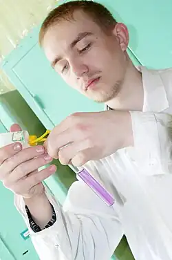 - Диоксид серы медленно барботируют через 0,025% водный раствор фуксина, до тех пор, пока раствор не изменит цвет.