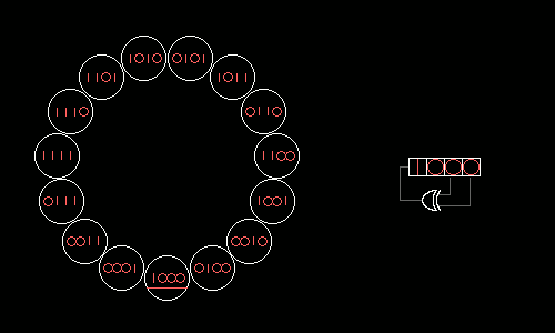 Поскольку внутреннее состояние на седьмом шаге вернулось к исходному, то, начиная со следующего шага, будет идти повтор битов. То есть генерируемая последовательность такова: (порядок бит в последовательности соответствует порядку их генерации РСЛОС). Таким образом, период последовательности равен 7, то есть максимально возможному значению, что произошло в силу примитивности заданного многочлена.