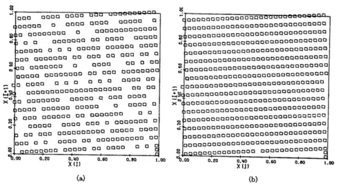 Линейный конгруэнтный генератор показывает плохую n-пространственную однородность. На рисунке предвиден пример результата работы для для 384 точек (a) и 512 (b).[1]