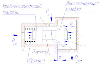 На рис. 1 показана конструктивная схема простейшего редукционного клапана. При увеличении входного давления Рн возрастает давление в полости Б, а также давление в полости В (редуцированное давление Рред). Под действием возросшего редуцированного давления плунжер смещается влево, тем самым уменьшая размер дроссельной щели у. При этом возрастает сопротивление потоку жидкости при прохождении её через дроссельную щель, а значит, возрастают и потери давления. Как следствие уменьшается значение редуцированного (выходного) давления Рред. Таким образом обеспечивается устойчивость значения выходного давления при изменении входного давления. В описанном процессе возросшее давление в полости Б не мешает перемещению плунжеров влево, так как это возросшее давление действует не только на дросселирующую конусную головку, но и на уравновешивающий поршень, и эти силовые воздействия уравновешивают друг друга.