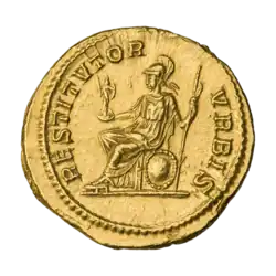Аверс:Легенда: «SEVERVS PIVS AVG». Голова Септимия Севера в лавровом венке, вправо. Реверс:Легенда: «RESTITVTOR VRBIS». Рома сидит на троне без спинки, влево. В руках палладиум и скипетр, внизу у трона стоит щит. |