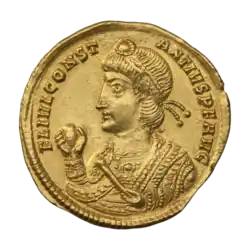 Аверс:Бюст Констанция II в доспехах, в фас. На голове шлем с нашлемником, в руках щит и копьё. Реверс:Рома и Константинополь сидят на тронах и держат щит с надписью «VOT/XXX/MVLT/XXXX». В левой руке Ромы копьё, Константинополь держит скипетр. Клеймо монетного двора: «SMNC». |