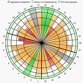 Результатом оценки является 8 оценок степени выполнения требований Стандарта по направлениям ИБ и итоговая оценка R. Значения всех групповых показателей ИБ и оценок по направлениям ИБ должны быть отображены на итоговой диаграмме соответствия (см. рисунок).