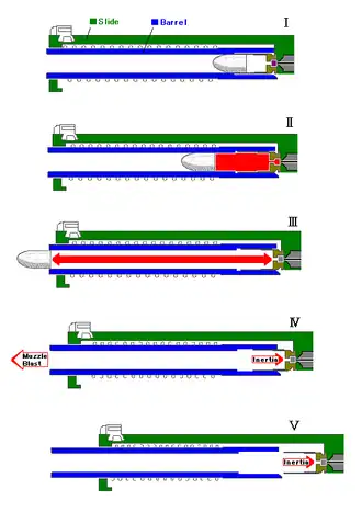 I — положение перед выстрелом; II — давление пороховых газов превысило давление форсирования, пуля врезается в нарезы ствола, но гильза, удерживаемая инертной массой затвора и трением стенок, плотно прижатых давлением к патроннику, отходит назад лишь на несколько миллиметров; III — пуля покидает ствол, гильза за это же время вышла из патронника только своей утолщённой частью у основания; IV, V — давление в стволе падает, трение в патроннике резко снижается, и гильза отходит назад под действием остаточного давления и инерции, толкая затвор, этим приводя в действие автоматику перезаряжания.