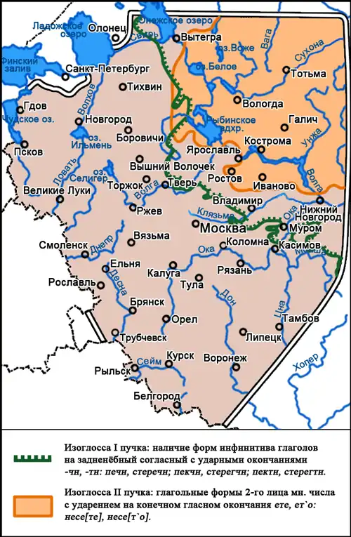Среди диалектных явлений II пучка изоглосс отмечаются следующие: Употребление глаголов 2-го лица мн. числа с ударением на конечном гласном окончания: ед[те́], ед[т’о́] (едите), сиди[те́], сидит[т’о́] (сидите), несе[те́], несе[т’о́] (несёте) и т. д. (см. изоглоссу на карте) Произношение слова молния как мо́внийа. Распространение слов огоро́д (изгородь), у́повод (период работы без перерыва), хорово́д и др.[1]