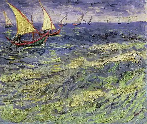 Ещё одним морским пейзажем Ван Гога стал «Вид на море в Сент-Мари» (F415), в котором он стремился передать влияние света на море. Он пишет: «Средиземное море имеет цвет макрели: другими словами, изменчивое — вы не всегда знаете, зелёное оно или фиолетовое, вы не всегда знаете, синее ли оно, поскольку в следующий момент постоянно меняющийся блеск принимает розовый или серый оттенок». По сравнению с другим драматическим морским пейзажем, написанным Ван Гогом в Сент-Мари, этот спокойный и причудливый, с неопасными волнами[4]. Горизонтальные линии, близкие к горизонту, символизируют спокойное море, а закрученные линии и белые шапки на переднем плане создают ощущение турбулентности и отсылают к одной из любимых японских работ Ван Гога «Большая волна в Канагаве»[5]. На заднем плане рыбацкие лодки, возвращающиеся в деревню. Чтобы подчеркнуть контраст с зелёным цветом на картине, Ван Гог написал своё имя большими ярко-красными буквами в левом углу полотна[6].