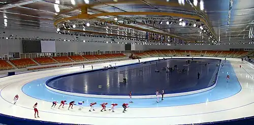 Стандартный 400-метровый овальный конькобежный стадион с двумя дорожками. 8000 мест для зрителей.