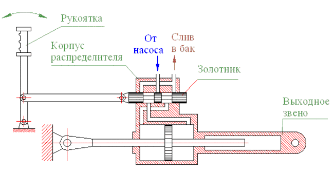 В рассмотренной конструкции распределителя перемещение золотника может вызываться не только линейным перемещением управляющей рукоятки, но и, при небольших конструктивных изменениях, возможно осуществить входное движение золотника с помощью вращательного движения руля (например, через винтовую передачу).