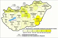 Носители словацкого языка проживают также на части территорий соседних государств, которые вместе со Словакией некогда входили в состав Венгерского королевства: в Венгрии (9888 из 29 647 венгерских словаков назвали словацкий родным, всего на нём в Венгрии говорят 16 266 человек, 2011)[18] и на Украине — прежде всего, в районах Закарпатья (2633 из 6397 словаков)[19][20]. Помимо этого, на словацком говорят жители ряда других территорий бывшего Венгерского королевства, не граничащих со Словакией: жители Румынии — в основном, в районах Трансильвании и Баната (12 574 из 13 654 словаков назвали словацкий родным, всего на нём в Румынии говорят 12 802 человека, 2011)[21], жители Сербии — прежде всего, в автономном крае Воеводина (49 796 из 52 750 сербских словаков назвали словацкий родным, при этом в Воеводине проживают 47 760 носителей словацкого из 50 321 словака, 2011)[22][23], и Хорватии — в основном, на востоке страны — в Вуковарско-Сремской и Осиецко-Бараньской жупаниях (3792 из 4753 хорватских словаков, 2011)[24][25].