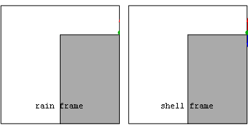 Изображения в системе отсчета дождя (rain frame) и поверхности (shell frame) собственного (красное) и геометрического (синее) ускорения для объекта, который скатывается со скалы.Примечание: Система отсчета дождя, в отличие от капли дождя, больше похожа на прыжок на батуте, траектория которого заканчивается сразу, как мяч достигает края скалы. Система отсчета поверхности знакома жителям планеты, которые полагаются на физическое ускорение вверх от своей среды, защищающее их от геометрического ускорения искривленного пространства-времени. Неудивительно, что вначале микрогравитационная среда может их напугать.