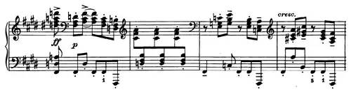 | 6 | 313-329 | В такте 313 отрывок из allegro fantastico завершается кульминацией, основанной на теме meno mosso. Фраза из четырёх тактов звучит три раза, каждый раз на квинту ниже, сначала ре-бемоль мажоре, затем в соль-бемоль мажоре и, наконец, в си-мажоре. Однако ожидаемая финальная кульминация прерывается повторным воспроизведением первой темы на пианиссимо. | ||