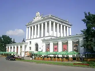 Главный вход | Архитектор И. Д. Мельчаков. Скульпторы Г. И. Мотовилов (рельефы на пилонах), С. М. Орлов, А. П. Антропов, Н. Л. Штамм, С. Л. Рабинович, И. Л. Слоним (скульптура тракториста и колхозницы)[4]. | 1951—1954 | |