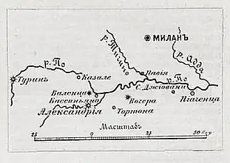 После поражения на реке Адде Моро отступил за реку Тичино. Имея двоякую задачу — прикрывать Турин и поддерживать сообщения с войсками Макдональда, находившимися в Неаполе — Моро одну часть своих войск направил к Турину, а с другой расположился, в ожидании прибытия Макдональда, на весьма сильной позиции между крепостями Валенцою и Александрией за реками По и Танаро.