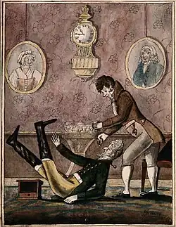«Богатый пациент упал из-за того, что модный дантист с такой силой удалил зуб», ок. 1790 г.