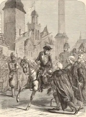 Последним достижением Суворова в первой польской кампании стало взятие Вавельского замка в Кракове, захваченного в ночь на 22 января (2 февраля) 1772 года отрядом французского подполковника Клода Габриэля де Шуази[36] в результате халатности преемника Суворова на посту командира Суздальского полка Штальберга. По получении сообщения о захвате замка Суворов двинулся с небольшим отрядом к Кракову, где соединился с другими русскими войсками и 24 января (4 февраля) 1772 года начал осаду замка. Попытка 18 (29) февраля 1772 года взять замок штурмом из-за отсутствия осадной артиллерии закончилась неудачей. Но Суворов продолжал осаду, в ходе которой постоянно пресекались попытки поляков прийти на помощь осаждённому гарнизону. В начале апреля прибыла осадная артиллерия. Часть замковых укреплений была разрушена. Среди гарнизона начался голод. 15 (26) апреля 1772 года защитники замка — 43 офицера и 739 нижних чинов — капитулировали[37]. 12 (23) мая за эту победу Екатерина II наградила Суворова 1 тысячей червонцев и ещё 10 тысяч рублей прислала ему для раздачи участникам взятия замка.