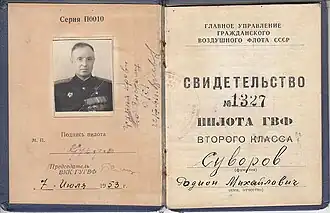 Родион Михайлович Суворов возлагает цветы к Монументу Победы на Поклонной горе, 9 мая 2005 года. Свидетельство № 1327 пилота ГВФ второго класса Суворова Р.М.