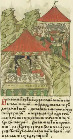 - ↑ Славянская энциклопедия. Киевская Русь — Московия: в 2 т. / Автор-составитель В. В. Богуславский. — М.: Олма-пресс, 2001. — Т. 1: А—М. — С. 280. — 784 с. — 5000 экз. — ISBN 5-224-02249-5. со ссылкой на Воскресенскую летопись