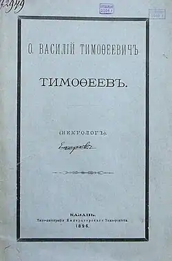 - ↑ О. Василий Тимофеевич Тимофеев. (Некролог) // Отдельный оттиск из журнала «Православный Собеседник» за 1896 год. — Казань: Типо-литография Императорского Университета, 1896. — С. (3). (Знаменский П. Некролог. Протоиерей Василий Тимофеев (1836—1895) // Кряшенская духовная миссия (Сайт для православных миссионеров) Архивная копия от 10 февраля 2017 на Wayback Machine)