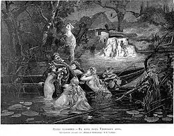 Существовало поверье что всю Троицкую субботу русалки выходят из реки, леса и раскачиваются на ветвях берёз, прячутся и катаются в цветущей ржи[26]. А в полночь встревоженный водяной поднимал воду из реки так высоко, будто бы гора вырастала из воды, но, услышав народные песни, успокаивался, и вода опять входила в берега. Для защиты от него всю ночь вдоль берегов молодёжь жгла костры[27]. Всю троицкую ночь с берёзками в руках молодые парни и девушки резво и весело, с громким смехом, с радостными кликами бегали по полям, «гоняя русалок»[28].