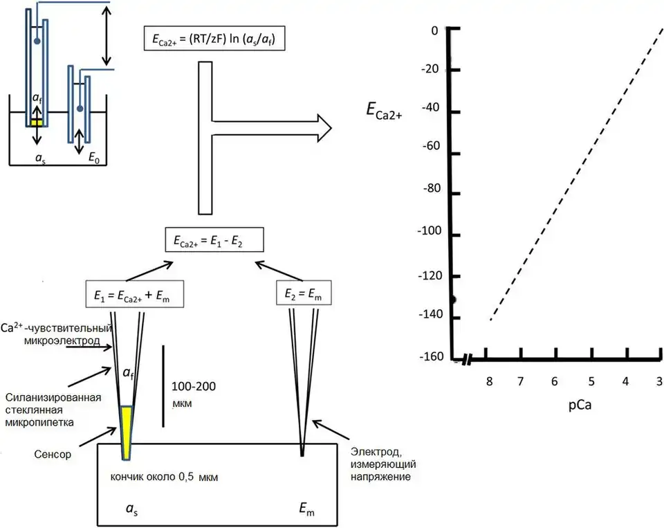 Эта научная проблема возникла в процессе прямых измерений, проведённых с помощью электродов, способных проникать внутрь клетки, способной к возбуждению; такие измерения изначально применялись для определения мембранных потенциалов[9]. Электроды, селективные к ионам натрия, калия, водорода и хлорид-иону, к тому времени были уже доступны и нашли широкое применение[10], однако использование кальций-селективных электродов было ограничено рядом трудностей. К электродам предъявлялось требование высокой селективности по отношению к ионам кальция на фоне других катионов, потенциально находящихся в системе, в том числе катионов магния, натрия и водорода, а также требование высокой стабильности системы с минимальным гистерезисом при изменении концентрации кальция. Тсиен разработал более Ca2+-селективные, нейтральные (в противоположность к применяющимся анионам — органическим фосфатам) лиганды в качестве сенсоров[11]. Более того, требовались электроды с достаточно малым диаметром кончика (около 0,4 микрон)[12] с тем, чтобы избежать повреждения клеток, что могло привести к артефакту — повышению локальной концентрации кальция. Однако необходимые для этого высокие сопротивления, связанные с электродом, порядка 20-30 и 60-120 ГОм в растворе с р(Ca2+) = 3 и требующиеся для использования кончика с диаметрами 1,5 или 0,5 мкм, в свою очередь, повлекли за собой создание адаптированных, сделанных на заказ электрометров с очень высоким входным импедансом и малыми стабильными токами смещения (меньше 10 фА) во избежание ложных сигналов.