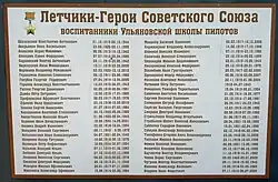 - ↑ Список «Лётчики — Герои Советского Союза, воспитанники Ульяновской школы пилотов» взят со стелы, установленный в 2015 году, на памятнике «Выпускникам школы» (бульвар Западный, Ульяновск).