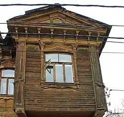 В средней части главного фасада равномерно по трём осям установлены окна обоих этажей. Эркеры прорезаны каждый широким окном. Оконные проёмы имеют лучковую перемычку, обрамлены одинаковыми наличниками, боковые стойки которых оформлены бриллиантовыми рустами, а верхняя доска украшена накладной орнаментальной резьбой. Завершаются наличники щипцовыми сандриками с боковыми импостами, увенчанными стилизованными вазонами. Снизу наличники дополнены фигурными фартуками[4].