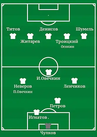 | «Динамо» Москва: [5]Чулков - Петров, Игнатов - Ленчиков, И.Овечкин, Неверов - Шумель, Тягунов, Житарев |